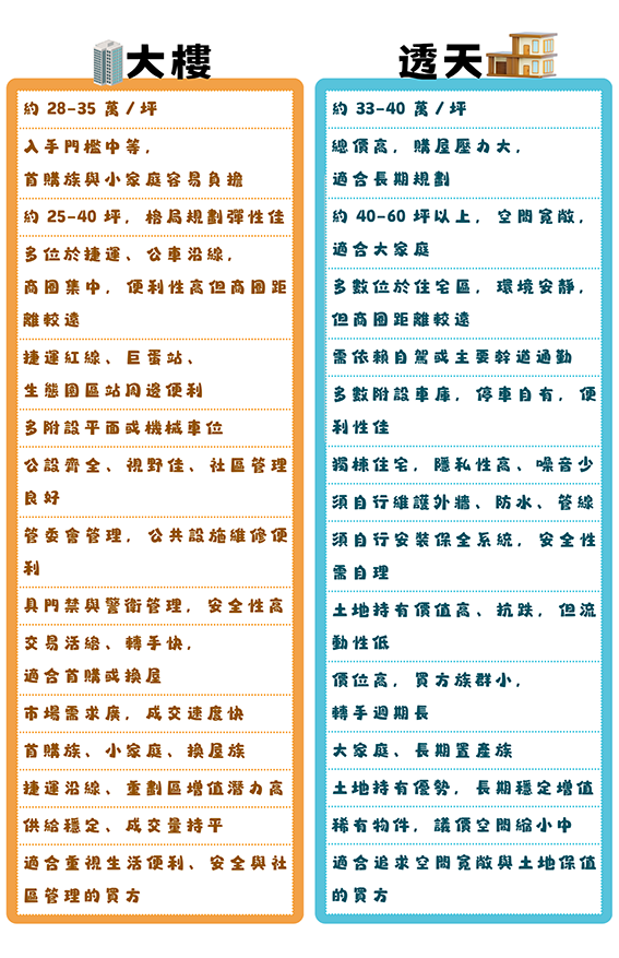 大樓以生活便利、社區管理完善、安全性高為優勢;透天則主打寬敞空間、獨立性佳、土地保值性強
